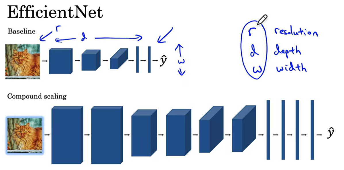 입력 이미지의 해상도(r)와 신경망의 깊이(d), 레이어의 너비(w)를 어떻게 설정할지를 고민할 수 있다. EfficientNet 논문의 저자는 이러한 세 가지 요소를 조정하여 신경망을 확장하거나 축소할 수 있다고 관찰했다. 해상도가 높은 이미지를 사용할 수도 있고, 신경망의 깊이를 깊게 할 수도 있으며, 레이어를 더 넓게 만들 수도 있다. 이 세 가지 요소를 동시에 조정하는 복합 스케일링(compound scaling)을 통해 이미지 해상도, 신경망의 깊이, 레이어의 너비를 동시에 확장하거나 축소할 수 있다.