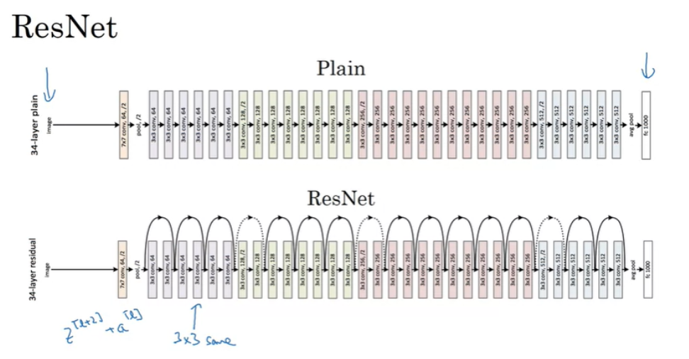 위 이미지는 논문에 있는 이미지이다. 그리고 'same convolution'을 사용하기 때문에 z^[l+2],a^[l] 의 dimension은 일치하게 된다. 만약 다른 Conv나 pooling이 추가되면 W_s 와 같은 것으로 dimension을 조정해주어야 한다.