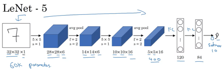 LeNet의 구조는 신경망이 깊어질수록 높이와 폭 (N_H,N_W) 이 줄어드는 경향이 있고, 채널 수(N_C)는 증가하고 있다. output에는 최근에는 softmax를 많이 쓰지만, 당시에는 다른 분류기를 사용했고, 현재보다 작은 신경망으로 약 60,000개의 파라미터를 가지고 있다.