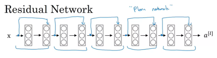 정리하자면, a^[l] 이 layer 를 하나 혹은 두개씩 건너뛰는 것을 의미한다. ResNet의 구성하는 방법은 이런 Residual Block들을 많이 사용해서 DNN을 구성한다.