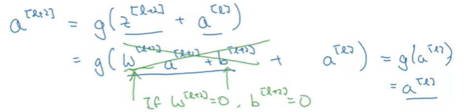 극단적으로 W^[l+2]=0, b^[l+2]=0이라고 가정해보자.