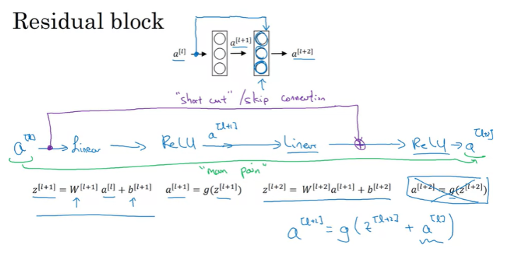 위와 같이 a^[l]이 2개의 layer를 초록색의 main path로 지나게 되면 a^[l+2]를 얻을 수 있다. Residual Block에서는 입력인 a^[l] 을 바로 다음 layer를 뛰어넘고, 그 다음 layer(ReLU를 적용하시키기 전)로 연결시켜준다. 이 path를 shortcut이라고 부르며, a^[l] 의 정보가 shortcut을 따라 더 깊은 layer로 바로 전달된다.