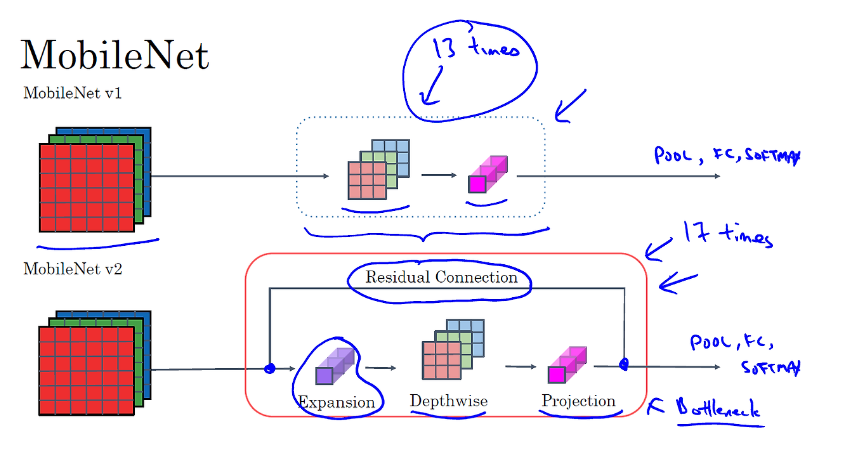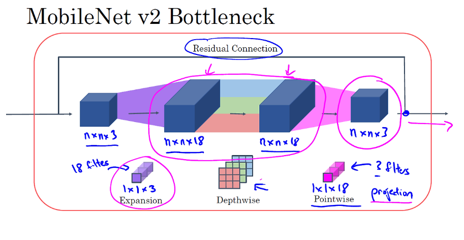 v1 는 depthwise separable convolution 이 13번 반복된다. v2 는 v1에서 residual connection(skip connection) 이 적용된 것이지만, depthwise 이전에 expansion 과정이 추가되고 17번이 반복된다. 빨간색 부분을 더 자세하게 살펴보자.