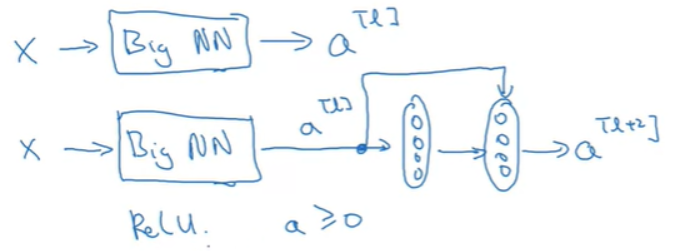 만약 L2 Regularization을 사용한다면 W^[l+2] 가 줄어드는 경향이 있을 것이고, bias에도 적용하고 있다면, b^[l+2] 도 줄어들 수도 있다.