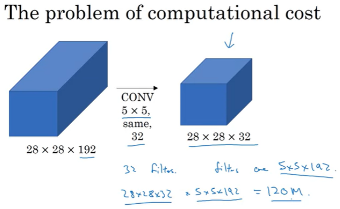 28x28x192 volume에 대해서 5x5 'same' conv 연산을 수행하면, 28x28x32x5x5x192로 1억2천만번의 연산이 수행된다.