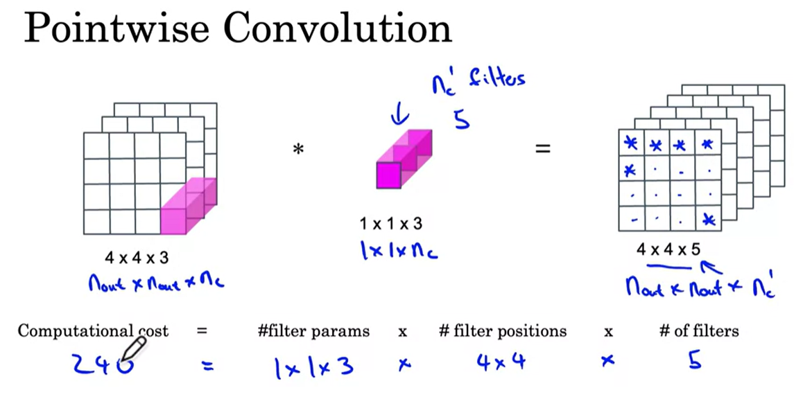 여기서, 주의할 점은 filter의 개수가 input 의 channel 과 같다는 것이다. 이렇게 계산하면 4 x 4 x 3 이 output size가 된다. 하지만, 4 x 4 x 5 가 되기 위해서는 추가적인 계산 과정이 필요하다. pointwise convolution을 거친다.