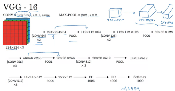 VGG-16 이름에서 유추할 수 있듯이 16개의 layer로 구성되어 있으며, 약 1억 3800만개의 파라미터가 있다. 이 수치는 오늘날에도 매우 큰 값이고, 학습시킬 파라미터가 매우 많은 큰 네트워크이다. 하지만, 네트워크가 매우 단순하고 균일한 구조를 가지고 있다는 점에서 매력적이다. VGG-19가 조금 더 큰 네트워크이지만, VGG-16과 거의 유사하다.