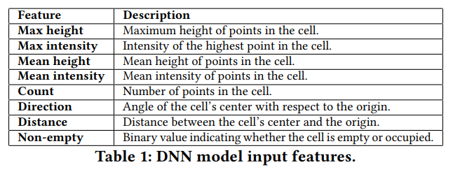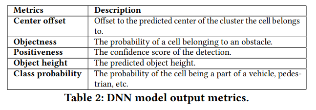 Deep neural network (DNN) 는 feature vector x를 입력으로 받아 각 cell 에 대한 output metrics 을 생성한다. 예를 들어 해당 cell 이 장애물의 일부일 확률 등을 예측한다. 이러한 출력 지표는 아래 Table 2에 나열되어 있다.