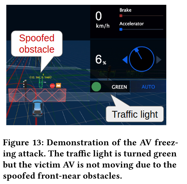 - 신호 대기 중인 자율 주행 차량이 교차로에서 영구적으로 "정지"하여 교통을 방해할 수 있는 AV freezing attack
