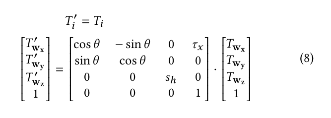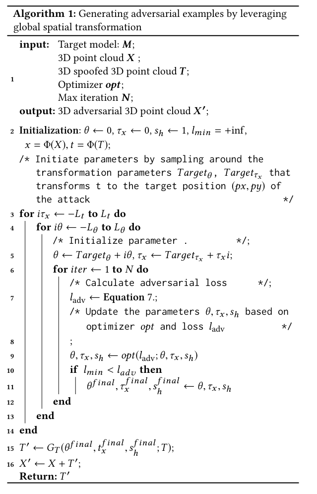 그래서, 논문은 스푸핑된 3D point cloud T 가 변형 파라미터들과 함께 주어질 때 변형된 적대적 스푸핑된 3D point cloud 를 나타내는 $T' = G_{T}(\theta, \tau_{x}, S_{h}; T) $ 등식을 사용할 수 있다.