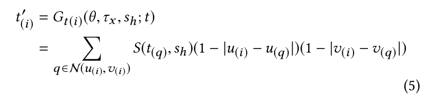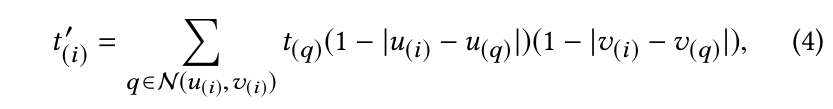 여기서 $\mathcal{N} (u_{(i)},v_{(i)})$ 는 위치 $(u(i), v(i))$ 에서 4 pixel neighbors 를 나타낸다. (top-left, top-right, bottom-left, bottom-right)