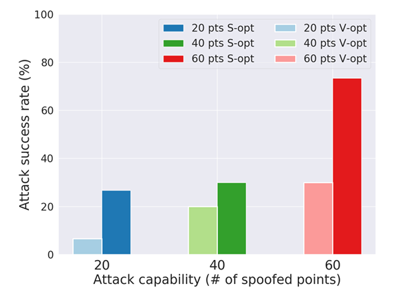 위의 그림은 성공률이 더 스푸핑된 point 들과 함께 증가했다는 것을 보여주며, 이는 attack 능력이 더 스푸핑된 point 들과 함께 증가되었기 때문에 기대된다. 특히, attacker 가 60개의 스푸핑된 point 들을 inject 했을 때, attack 성공률은 논문의 개선된 optimization method 를 사용해서 약 75% 달성할 수 있었다.