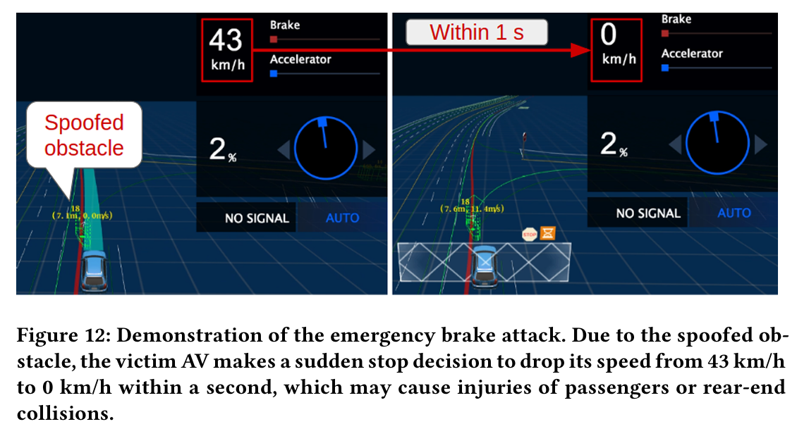 이 attack 에서는 움직이고 있는 희생 AV 에 앞쪽에 장애물을 스푸핑하는 적대적 3D point cloud 를 생성한다. 이러한 attack 하에 AV가 stop decision 을 한다는 것을 발견했다. Figure 12 에서 설명된것 처럼, 스푸핑된 앞쪽 근처 장애물이 촉발하는 stop decision 은 희생 AV 가 speed 을 43 km/h 에서 0 km/h 로 1초 내에 감소시킨다. 이러한 stop decision 은 hard brake 를 초래할 것이다.