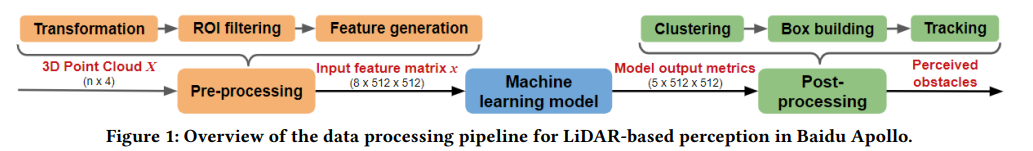 자율주행차(AV)는 실시간 위치 파악 (localization) 과 환경 인식을 수행하기 위해 다양한 센서에 의존한다. LiDAR, 카메라, 레이더, GPS/IMU는 다양한 자율주행 시스템에서 사용되는 주요 센서들이다. 이러한 센서에서 수집된 데이터는 AV 시스템에 유용한 정보가 되기 전에 변환 및 처리된다. 그림 1은 Baidu Apollo 의 인식 모듈에서 LiDAR 센서 데이터의 처리 파이프라인을 보여준다. 아래 figure 1 에 나와 있듯이, 세 가지 주요 단계가 포함된다.