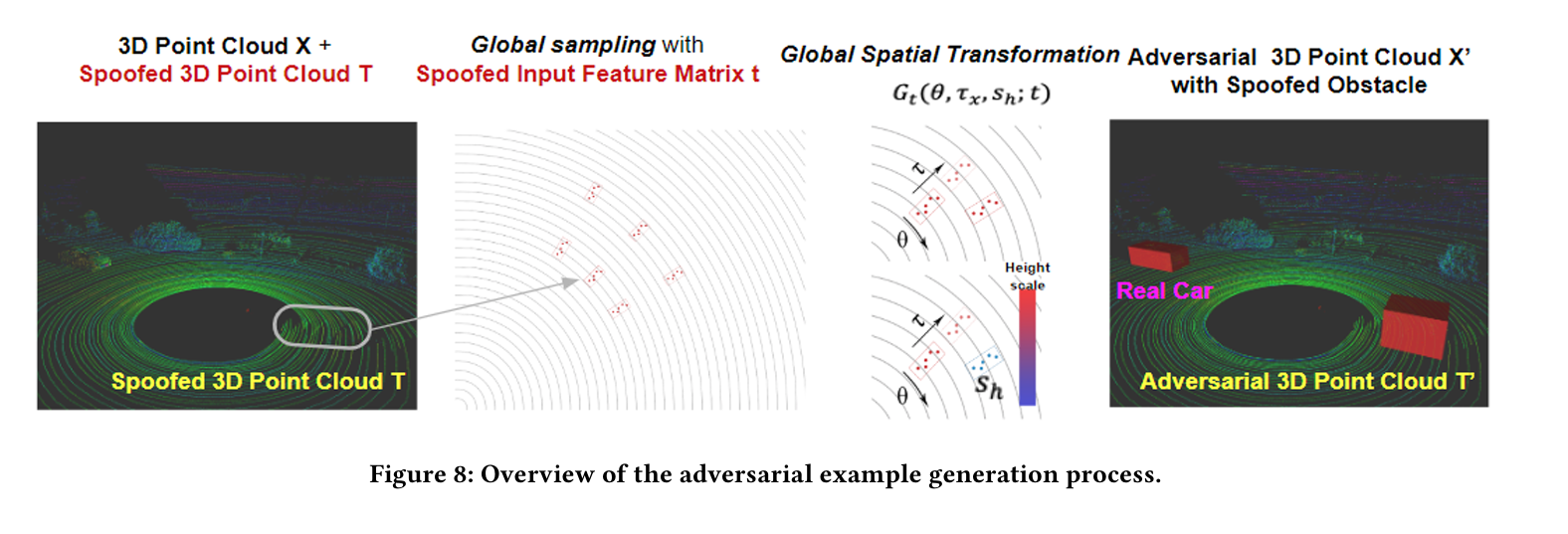 Figure 8 은 전반적인 적대적 example 생성 process 의 overview 를 제공한다. 3D point cloud $X$ 와 스푸핑된 3D point cloud T(Figure8(a)) 가 주어질 때, 논문은 우선, 해당 input feature matrix x 와 스푸핑된 input feature matrix t 를 얻기 위해 3D point cloud X 와 스푸핑된 3D point cloud T 를 $\phi$ 를 통해 mapping 한다. 그리고 나서 Figure 8 에서 보여진것 처럼 변형 파라미터들을 초기화하기 위해 sampling 알고리즘을 적용한다. 초기화 이후에, 적대적 loss function $\mathcal{L}_{adv}$ (Figure 8(c)) 관점에서 변형 파라미터를 더 optimize 하기 위해 optimizer opt 를 이용한다. 변형 파라미터와 T 를 가지고, 논문은 적대적 스푸핑된 3D point cloud T' 을 얻기 위해 식 (8) 을 사용해서 이중 변형 function $G_{T}$ 를 적용한다. 마지막으로, 적대적 3D point cloud X' 을 얻기 위해서, T' 을 3D point cloud X (Figure 8(d)) 에 더한다.