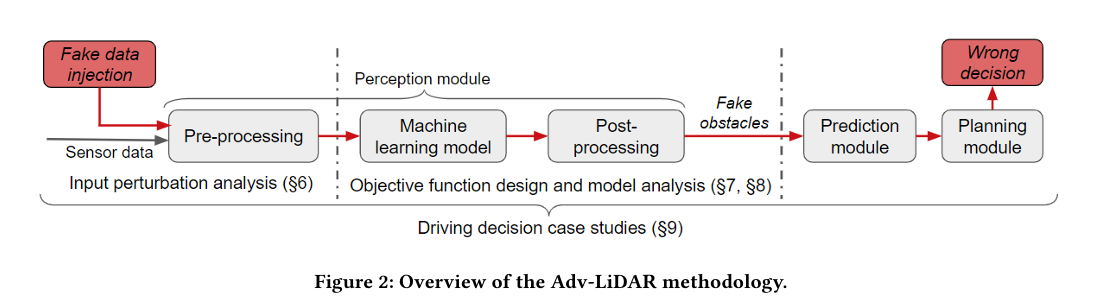 카메라 기반 인지에 대한 연구 노력에도 불구하고, 자율 주행 차량 환경에서 LiDAR 기반 인지의 보안에 대한 철저한 탐구는 이루어지지 않았다. LiDAR는 적외선 레이저를 사용하여 주변 장애물까지의 거리를 측정하며, 360도 시야각을 제공하고 2차원 이미지만을 제공하는 카메라와 달리 도로 환경의 3차원 표현을 생성할 수 있다. 따라서 LiDAR는 자율 주행 안전을 위해 카메라보다 더 중요한 센서로 간주되며, 오늘날 거의 모든 자율 주행 차량 제조업체에서 채택하고 있다. 최근의 몇몇 연구는 LiDAR에서 감지된 센서 입력에 spoof 된 point 를 inject 하는 것이 가능함을 시연하였다. 이러한 입력 또한 자율 주행 차량 인지 파이프라인에서 object detection 단계를 거쳐야 하기 때문에, 이러한 spoofing 이 LiDAR 기반 인지에서 도로 장애물과 같은 의미적으로 중요한 보안 문제를 직접적으로 유발할 수 있는지에 대해서는 아직 명확하지 않았다. 그래서,이 연구에서는 우리는 자율 주행 차량 환경에서 LiDAR 기반 인지의 보안을 탐구하기 위한 최초의 연구를 수행한다.