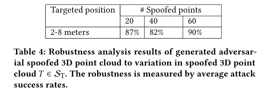 스푸핑된 3D point cloud 에서 변화의 robustness 를 평가하기 위해, 주어진 스푸핑된 3D point cloud $\mathcal{T} \in \mathcal{S}_{T} $ 에 대해서, 논문은 3D point cloud $X$ 를 가지고 해당 적대적 스푸핑된 3D point cloud $\mathcal{T}'$ 을 생산한다. 다음으로, 논문의 LiDAR 스푸핑 attack 실험 환경을 사용해서 5개 이상의 스푸핑된 3D point cloud traces $(\mathcal{T}_{1}, \mathcal{T}_{2}, \mathcal{T}_{3}, \mathcal{T}_{4}, \mathcal{T}_{5})$를 생산한다. 다음으로, $ (\mathcal{T'}_{1}, \mathcal{T'}_{2}, \mathcal{T'}_{3}, \mathcal{T'}_{4}, \mathcal{T'}_{5}) $ 을 생산하기 위해 $\mathcal{T}$ 로부터 $\mathcal{T}'$ 을 생산하는 같은 변형을 사용한다. 그리고 나서, 이들 각각을 $\mathcal{X}$ 와 합쳐서 attack 을 launch 한다. 아래 Table 4 는 다양한 attack 능력에 대해 평균 성공률을 보여준다.