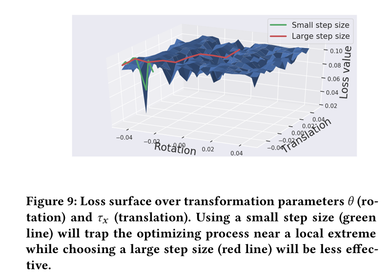vanilla optimization process 동안, 논문은 변형 파라미터에 대한 loss surface 가 작은 scale (초록색 선) 에서는 noisy 하고 큰 scale (빨간색 선) 에서는 꽤 평평하다는 것을 관측했다. 이는 최적화 기반 method 에 대한 적절한 step size 를 선택하는 문제로 이어진다. 예를 들어, 작은 step size 를 선택하는 것은 optimizing process 를 local minumum 주변에 빠지도록 할 것이다. 반면에, 큰 step size 를 선택하는 것은 잘못된 방향을 가리키는 noisy 한 local loss 때문에 덜 효율적이게 될 것이다. local minima 의 문제를 줄이기 위해 다양한 시작 point 를 선택하는 Carlini 등과 다르게, 논문의 setting 하에 optimization process는 perturbation 들의 강한 제약때문에 나쁜 local minima 에 빠지게 되기 쉽다. 논문은 큰 scale 로 sampling 을 사용하고, 작은 scale 로 optimize 하는 방식을 제안한다. optimization process 를 다양한 위치에서 시작하기 위해서, 변형 파라미터의 범위를 계산해서 변형된 스푸핑된 3D point cloud 가 target area 에 위치되도록 한다. 그리고 나서, 회전과 번역 파라미터에 대해서 n 개를 균일하게 sampling 한다. 그래서 시작하기 위해서 $n^{2}$ 개 sampling 을 구성한다.
