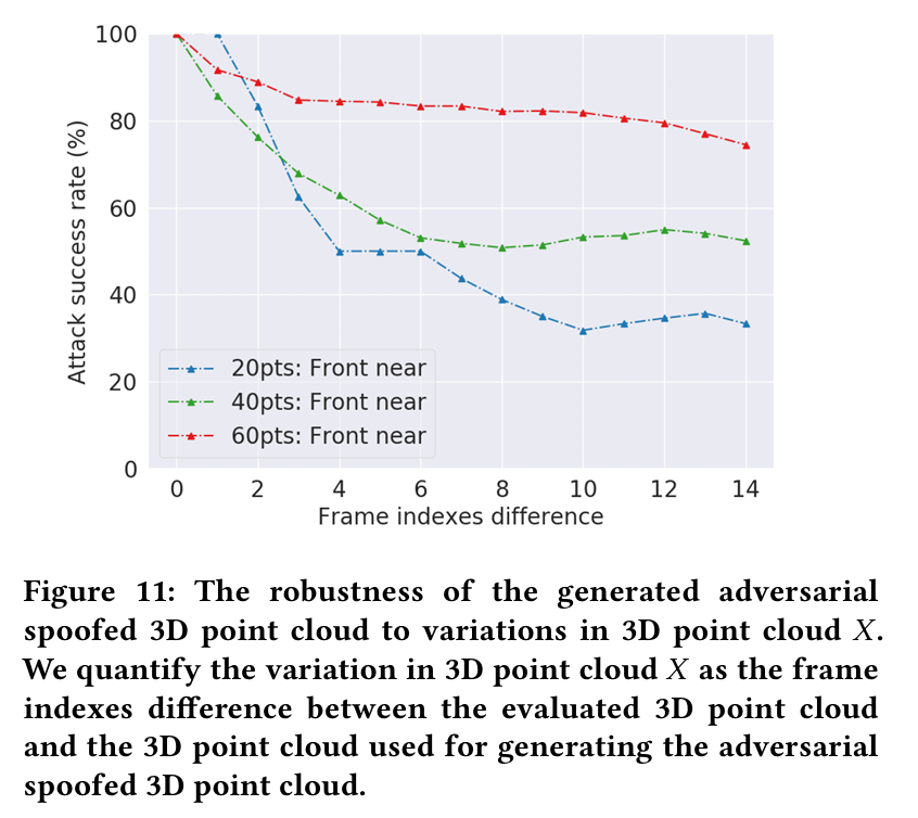 3D point cloud 에서 변화에 robustness 를 측정하기 위해서, 우선 모든 3D point cloud frame 들을 선택한다. 이 frame 은 성공적인 적대적 스푸핑된 3D point cloud 를 생성할 수 있다. 프레임 각각에 대해 생성된 적대적 스푸핑된 3D point cloud 를 15 연속적인 frame (around 1.5 s) 에 적용한다. 이후에, 성공률을 계산한다. 아래 Figure 11. 은 분석 결과를 보여준다.