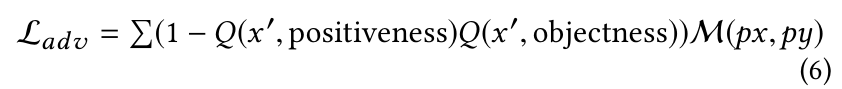 machine learning model level 에서만 분석을 수행하는 이전 연구와 달리, 전방에 가까운 장애물을 스푸핑하는 attack 목적을 반영하는 명백한 objective function 이 없다. 그러나, 효과적인 objective function 을 만드는 것은 효과적인 적대적 example 을 생성하는데 필수적이라고 보여져왔다. 효과적인 objective function 을 설계하기 위해서, 논문은 machine learning output 의 후처리 단계를 분석한다. §2.1 에서 보여진 것처럼, clustering process 에서, model output 의 각각의 cell 은 objectness(객체성) 값에 의해 필터링된다. clustering process 이후에, 후보 object cluster 들은 positiveness(양성) 값에 의해 필터링된다. 이러한 관측하에, 논문은 적대적 loss $\mathcal{L}_{adv}$ 를 아래와 같이 설계했다.