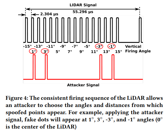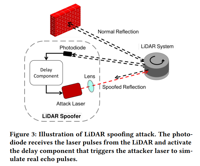 : Shin 등의 attack 은 3가지 구성요소 (photodiode, delay component, 적외선 laser) 를 포함한다. 아래 Figure 3 에 있다. photodiode 는 희생자 LiDAR 와 동기화하기 위해 사용된다. 이는 희생자 LiDAR 로부터 발사된 laser pulses 를 포착할때마다 delay component 를 촉발한다. 그때, delay component 는 attack laser 를 촉발하고 나서 희생자 LiDAR 의 다음 발사 cycle 을 attack 한다. laser pulse 의 발사 순서는 일정하기 때문에, adversary 는 pulse 파형을 조작하여 어떤 fake point가 point cloud 에서 나타날것인지를 선택할 수 있다.