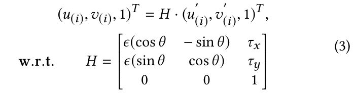 논문은 스푸핑된 input feature t' 위에 i번째 위치의 값을 나타내기 위해 $t'_{(i)}$ 을 사용하고, 그 위치를 나타내기 위한 2D 좌표 $(u'_{(i)}, v'_{(i)})$ 를 사용한다. homography matrix $H(\theta, \tau, \epsilon) $ 을 적용해서 t' 은 임의의 instance t 로부터 변형되고 여기서 $ t \in S_{t}$ 이다. $t_{(i)}$ 의 위치는 아래와 같이 $t'_{(i)}$ 로 유도될 수 있다.