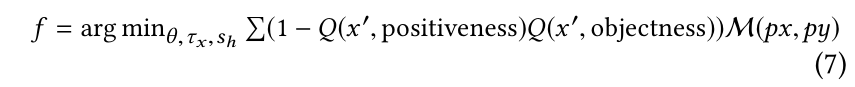 위에 $\mathcal{L}_{adv}$ 설계와 함께, 최적화 문제는 다음 objective function 을 minimize 하는 변형 파라미터 $\theta, \tau_{x}$, 스칼라 $S_{h}$ 를 얻기 위해 adam optimizer 를 사용해서 직접적으로 해결되었다.