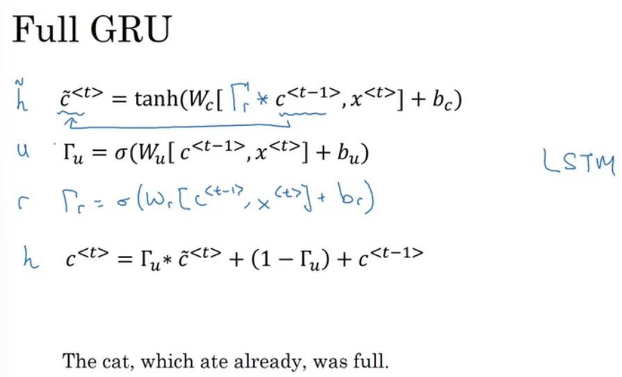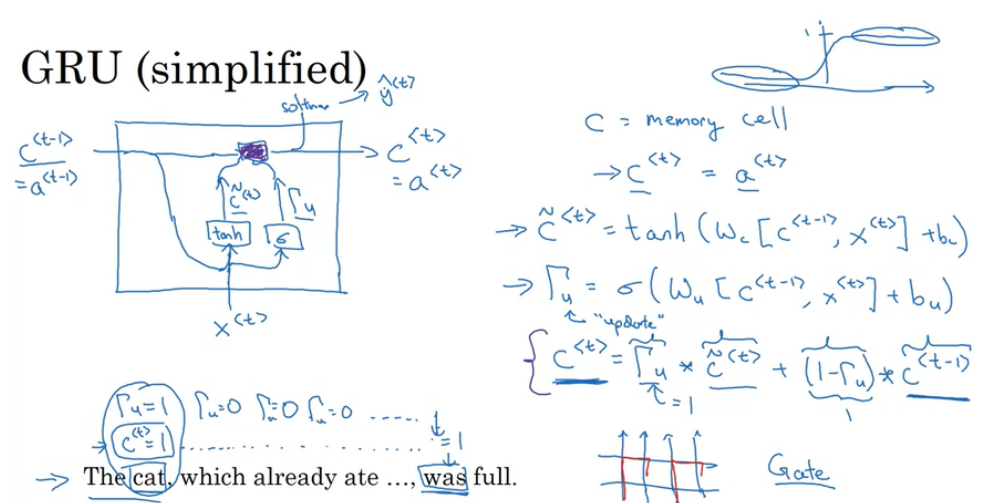 GRU를 간단하게 표현하면 위와 같다. 여기서 새롭게 나타나는 c는 memory cell을 의미하며 이전 정보들이 저장되는 공간이다. 이전 정보가 $ c^{<t-1>} = a^{<t-1>} $ 를 통해 전달되고, 이전 정보와 현재 input $ x^{<t>} $ 와 결합하여 다음 time step으로 전달된다. 즉, 이전 예시처럼 문장 앞쪽의 단수/복수 정보가 뒤쪽까지 전달되어서 'was'를 예측하는데 영향을 끼칠 수 있게 된다.