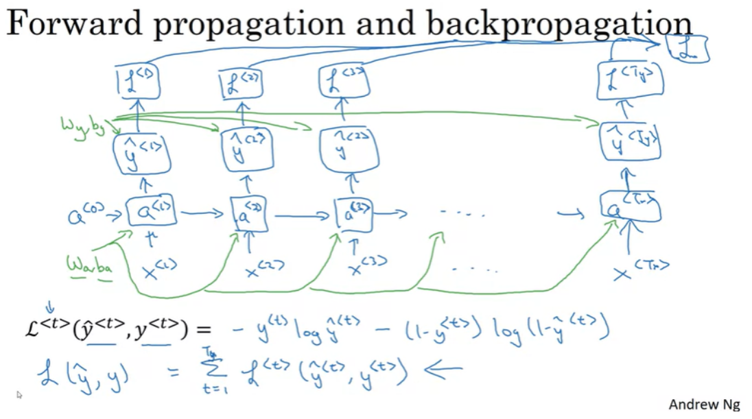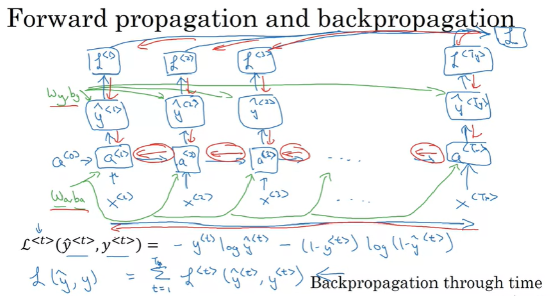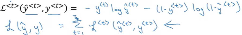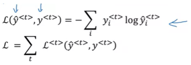 일단, 이전 강의 내용에서 살펴봤드시, $ W_{a}, b_{a} $ 를 통해서 $ a^{<t>} $ 를 구하고, $ W_{y}, b_{y} $ 를 통해서 예측값 $ \hat{y}^{<t>} $ 를 구한다. 그리고 Back propagation 을 계산하기 위해 loss function 을 통해서 실제 결과과 예측값의 Loss(error) 를 계산하고, 총 loss 값을 구한다. Cross Entropy Loss (Logistic regression Loss) 를 사용할 수 있는데, 각 element의 loss 와 총 loss는 다음과 같다.