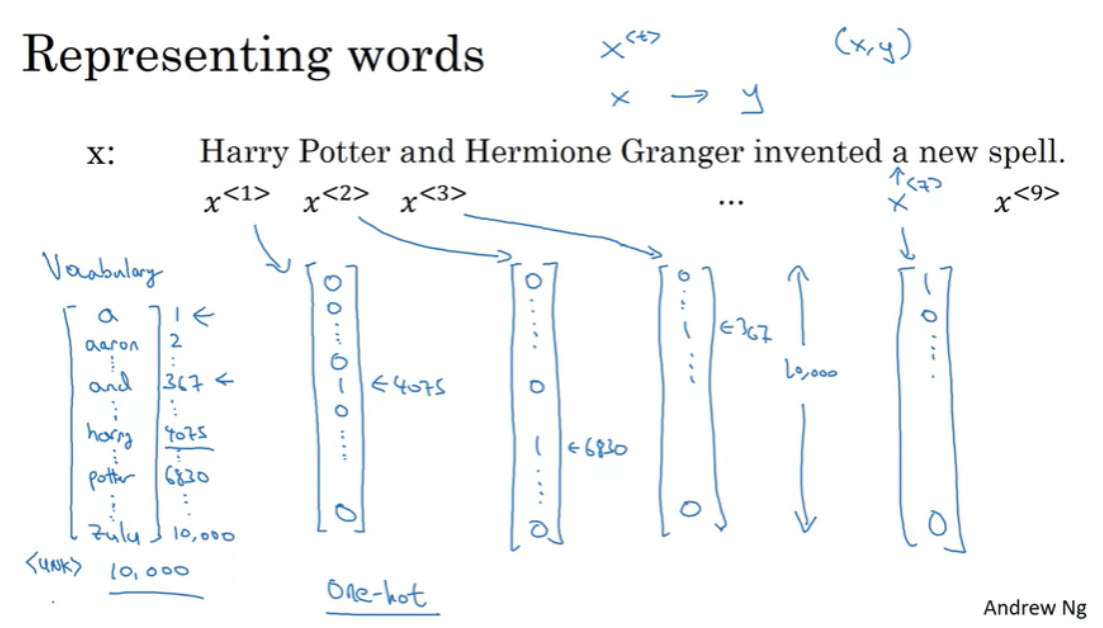 예를 들어, 'harry'를 나타내는 단어 $ x^{<1>} $ 는 4075번째 위치만 1이고 나머지는 0인 벡터이다.(사전의 4075번째 위치가 'harry'이기 때문)