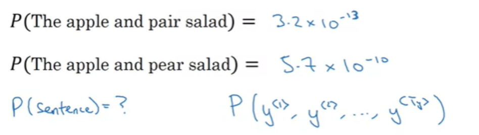 세 개의 단어를 가지는 문장으로 정리해보자면, 첫 번째 단계에서 softmax output은 $ y^{<1>} $ 의 확률을 알려주고, 두 번째는 이전 단어가 $ y^{<1>} $일 때, $ y^{<2>} $의 확률, 세 번째는 이전 단어가 $ y^{<1>}, y^{<2>} $일 때 $ y^{<3>} $의 확률을 알려주게 된다. 즉, $ P(y^{<1>}, y^{<2>}, y^{<3>}) $ 은 다음과 같다.