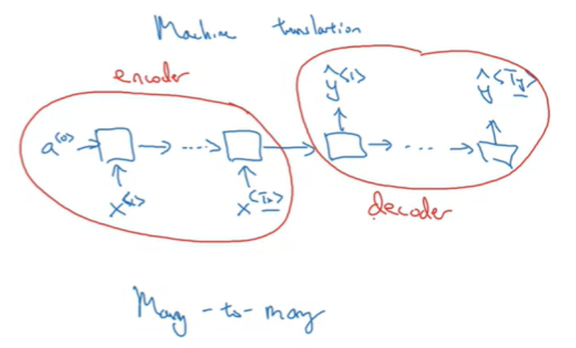 기계번역(machine translation)는 Many-to-many 아키텍처지만, 입력과 출력의 길이가 다를 수 있다. $ T_{x} = T_{y} $
