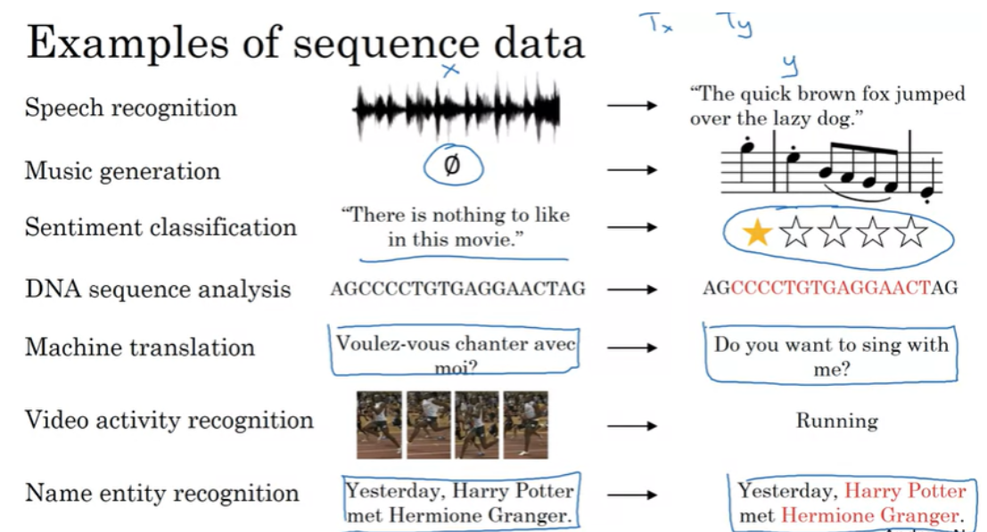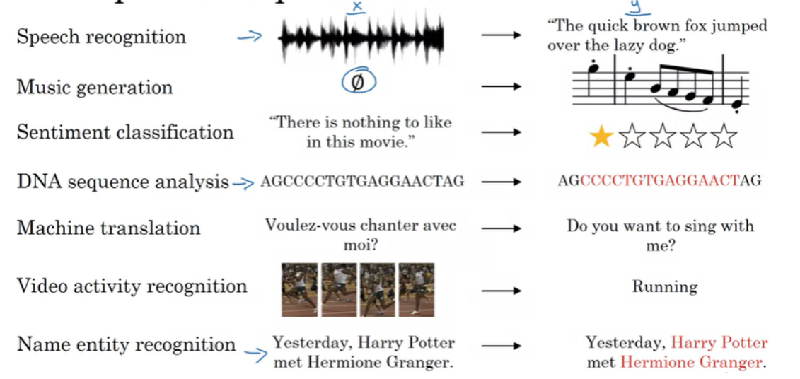 Recurrent Neural Network (RNN) 같은 모델은 음성 인식, 자연어 처리(NLP) 영역에 영향을 끼쳤다. 아래는 Sequence model 이 사용되는 몇 가지 예시들이다.
