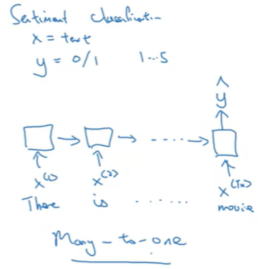 만약 Sentiment classification처럼 x는 텍스트이지만, y가 0/1의 값을 갖는 output이라면 Many-to-one 아키텍처로 다음과 같이 모델링 할 수 있다.