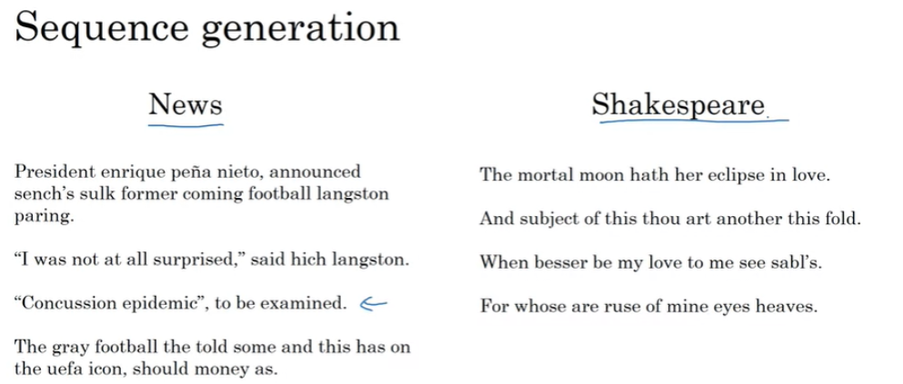 뉴스 기사로 학습된 시퀀스 모델은 왼쪽과 같은 텍스트를 생성하고, 셰익스피어의 책에 의해 훈련된 모델은 셰익스피어가 쓴 것과 같은 텍스트를 생성한다.
