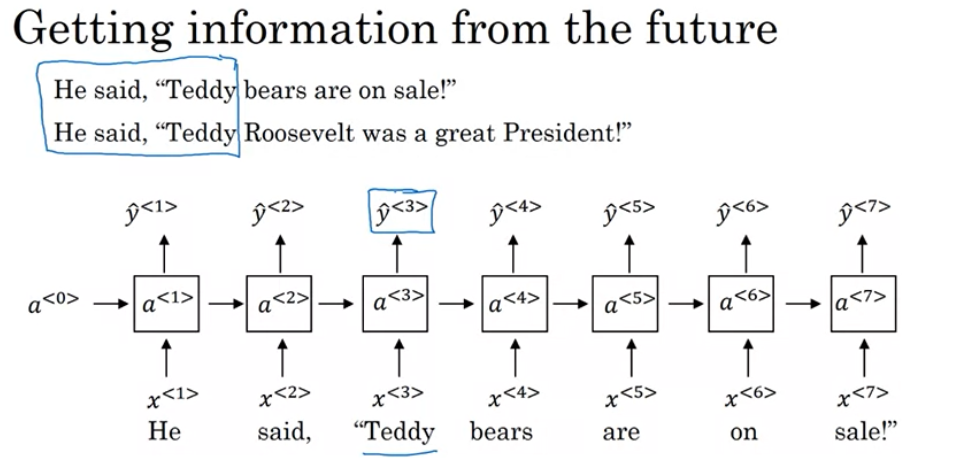위 기본 RNN 모델의 단점은, 앞서 나온 정보만을 사용해서 예측을 한다는 것이다. $ y^{<3>} $ 을 예측할 때, $ x^{<4>}, x^{<5>}, x^{<6>} $ 의 정보를 사용하지 않는다. 이는 문제가 될 수 있다.