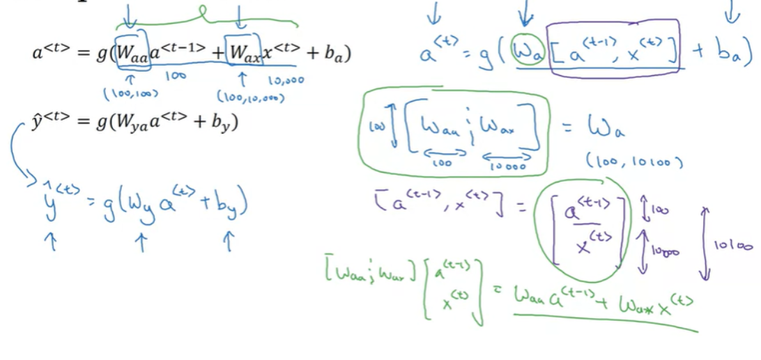 $ W_{a} $ 와 연산되는 $ [a^{<t-1>}, x^{<t>}] $ 는 $ \begin{bmatrix} a^{<t-1>} \\ x^{<t>} \end{bmatrix} $ 를 의미하고, 10100 차원의 vector 가 된다.