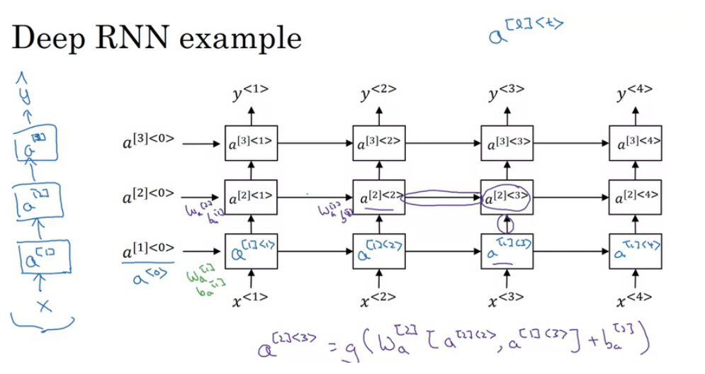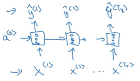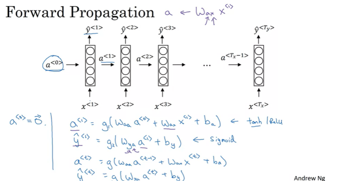 $ \hat{y}^{<t>} = g(W_{y}*a^{<t>} + b_{y}) $ 으로 표현할 수 있다.