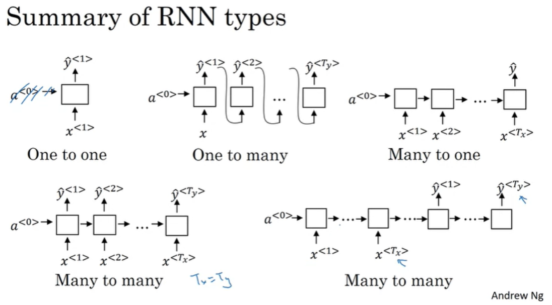 지금까지 RNN 아키텍처에서는 $ T_{x} $ 와 $ T_{y} $ 가 동일한 경우를 살펴보았다. 하지만 항상 같지 않을 수 있으며, 다양한 RNN 아키텍처를 살펴보도록 하자.