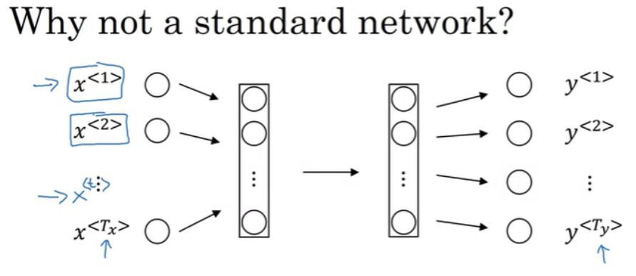 그리고 여러개의 training data가 있을 때, 이전과 동일하게 (i)를 위첨자에 사용해서 i번째 training data를 나타내서, $ x^{(i)<t>} $ 로 나타내며, $ T_{x} $ 가 한 시퀀스의 길이를 뜻하므로, training set의 서로 다른 데이터의 길이는 다를 수 있고, i번째 트레이닝 데이터의 길이는 $ T_{x}^{(i)} $ 로 표기한다.