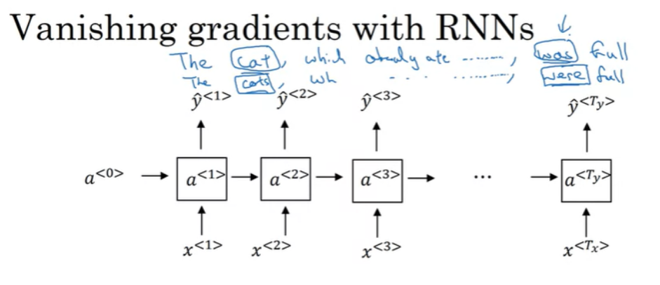 즉, cat나 cats처럼 단수/복수 명사가 문장 초반에 존재했다라는 것을 기억하고 있어야 제대로된 예측을 할 수 있는데, RNN의 경우에는 가까이에 있는 것에 영향을 더 많이 받는다. $ y^{<3>} $ 은 $ y^{<3>} $ 에 가까이 있는 값(입력)에 영향을 받는다. 이것이 Basic RNN 알고리즘의 약점이다.