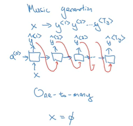 Music generation과 같은 모델은 입력이 정수일 수도 있고, 어떤 음악 장르나 원하는 음악의 첫 음표일 수도 있으며, 어느 것도 입력하고 싶지 않다면 null 입력일 수도 있고, 항상 0일 수도 있다. 이런 모델은 One-to-many 아키텍처이며, 다음과 같이 하나의 input x와 시퀀스 output y를 가질 수 있는 모델이 된다.