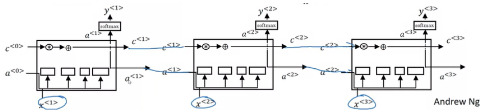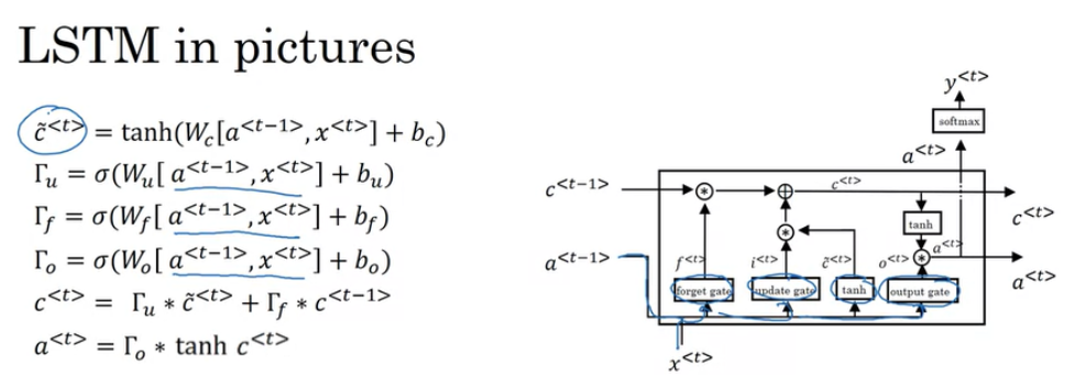 GRU보다 조금 더 복잡한데, 우선 이전 time step에서 전달받는 input이 $ c^{<t-1>} , a^{<t-1>} $로 추가된다.