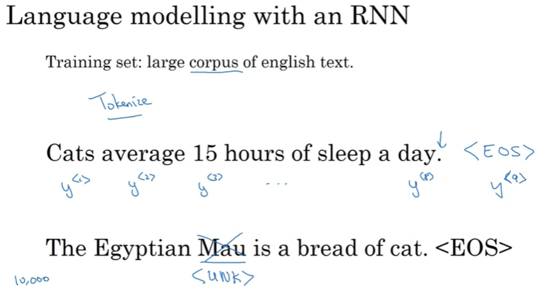 이러한 언어 모델은 RNN을 사용해서 만들 수 있는데, 이런 모델을 만드려면 large corpus of english text를 포함하는 training set이 필요하다. (corpus라는 단어는 NLP 용어로 큰 영어 문장들을 의미한다.)