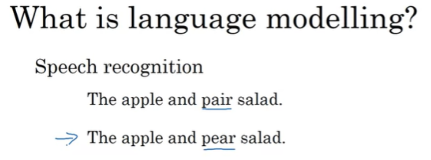 The apple and pear salad라는 문장을 들었을 때, 위 두 가지 문장이 있다면 두 번째 문장이 더 가능성이 있다고 생각할 것이다. 여기서 두 번째 문장을 선택하는 방법은 두 문장의 확률이 얼마인지 알려주는 언어 모델을 사용하는 것이다.