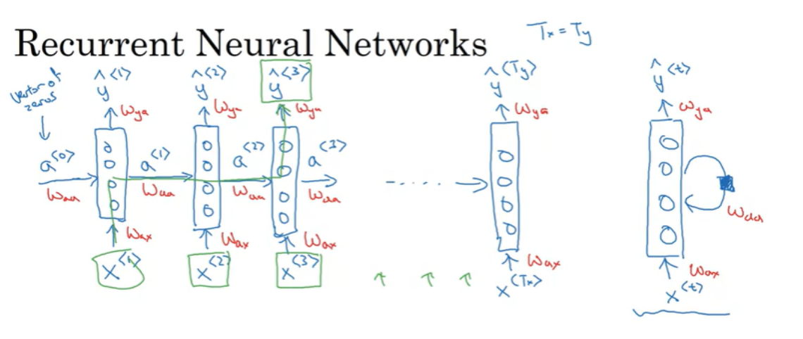위의 오른쪽 처럼 하나의 NN 만 표현하고 순환하는 표시로 RNN 을 표현하기도 한다. 이는 매 시점에서 parameter 를 공유한다는 것을 의미한다. ( $ W_{aa}, W_{ax}, W_{ya} $ 가 사용됨 )