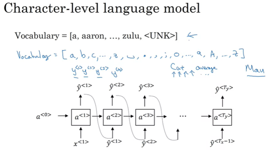 언어 모델의 기본 작업은 문장을 입력하는 것인데, 이 문장은 $ y^{<1>}, y^{<2>}, \cdots $로 표현하겠다. 언어 모델에서 문장을 input x가 아닌 output y로 표시하는 것이 유용하다.