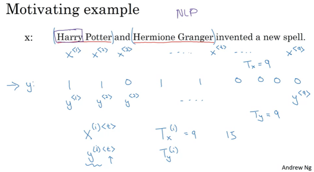 예를 들어서 'Harry Potter and Herimone Granger invented a new spell'이라는 input 가 있고, 이 문장에서 이름을 인식(Name entity recognition) 한다고 했을 때, 각 단어마다 output y를 가지며, output 값은 이름인지 아닌지에 대한 1 / 0의 값을 가진다.