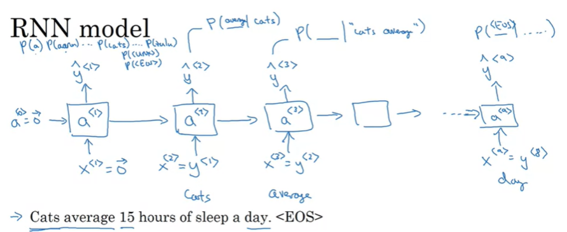 여기서 $ \hat{y}^{<1>} $ 는 softmax output이며, 첫 번째 단어가 존재할 확률을 의미한다. 이 예제에서는 첫 번째 단어 cats가 될 것이다.