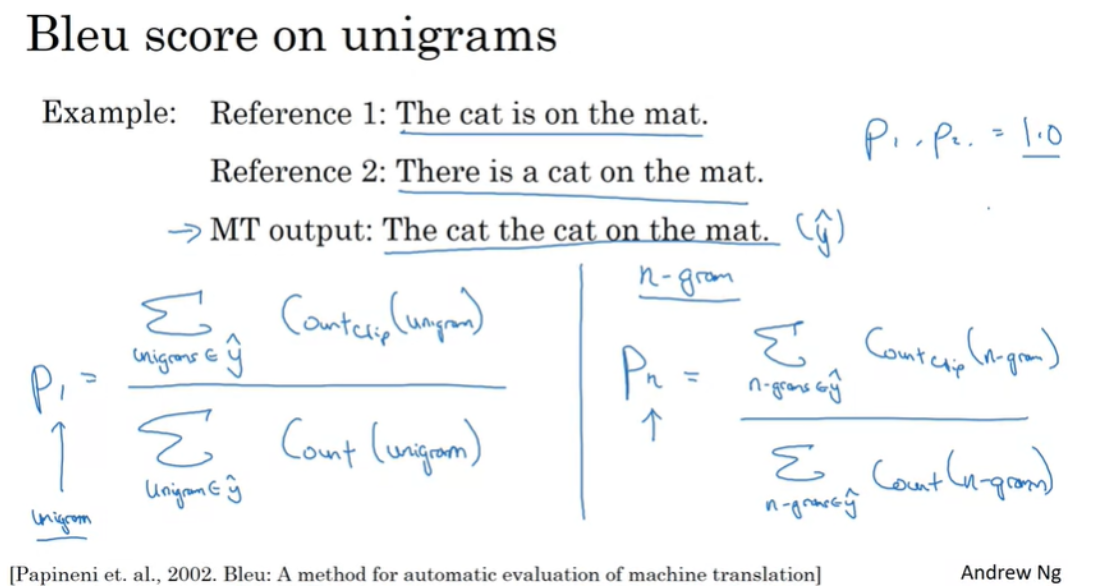 즉, MT output 에서 각 단어 쌍들의 Count와, MT output의 단어쌍들이 Reference에 얼마나 등장하는지 Count해서 계산하게 된다.
